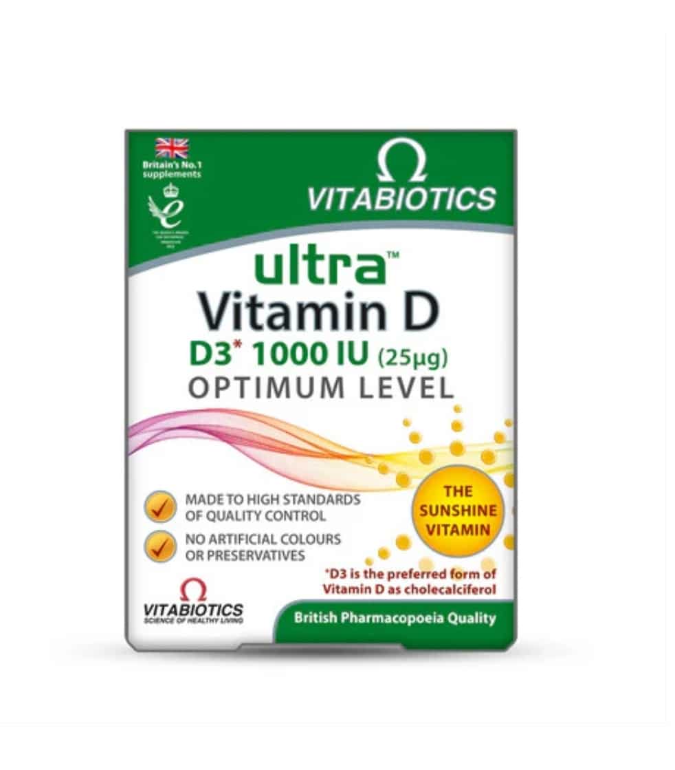 Vitabiotics Ultra D3 contains 25mcg (1000 iu) Vitamin D3 per tablet. Vitamin D3 is required in the body for the maintenance of bones and teeth, normal immune response, cell division and muscle function.